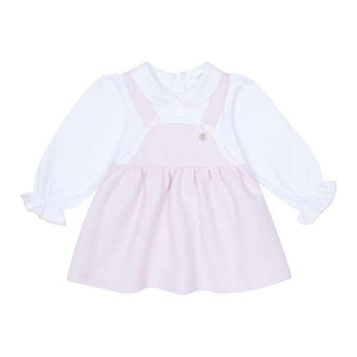 Beautiful long sleeved dress with pink pinafore design with zip fastening on the back for easy changing
