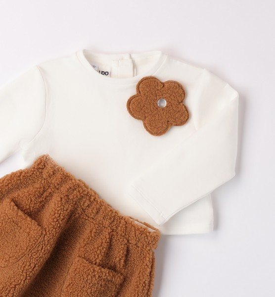 An ivory and brown skirt set for girls from Italian brand iDO Baby. The soft cotton top has a fluffy flower appliqué with a pearlescent centre on the front and buttons on the back to help with dressing. Matching the top’s motif, the skirt is made in fluffy bouclé fleece. It has patch pockets, an elasticated waist and satin lining for comfort.