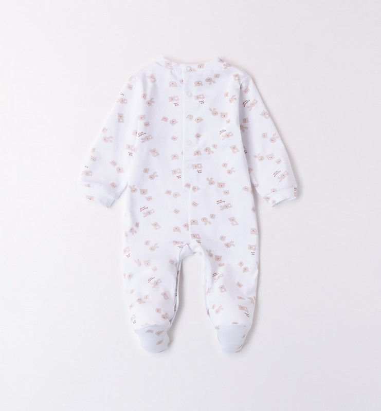 iDO unisex white all in one sleepsuit with cute beige bunny and bear all over print and two stripe pockets on the front.