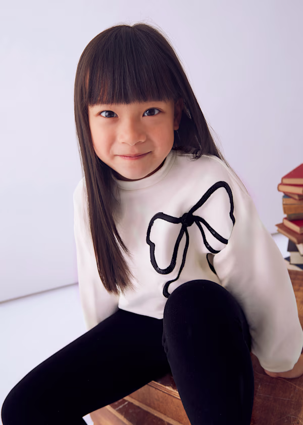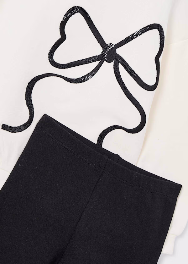 long sleeved jumper with large sequin bow on the front comes with black leggings to match.