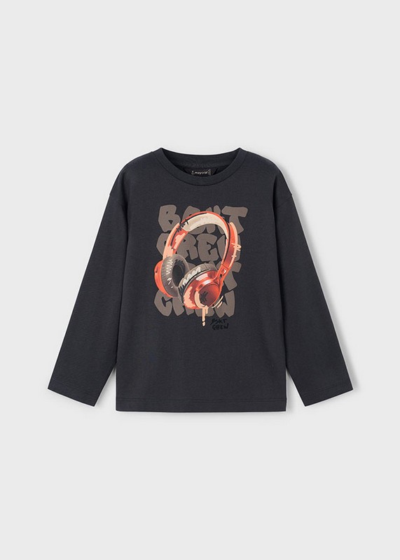 Mayoral for older boys darl grey, long sleeved cotton top with large headphones design on the front with hints of orange and beige tones.