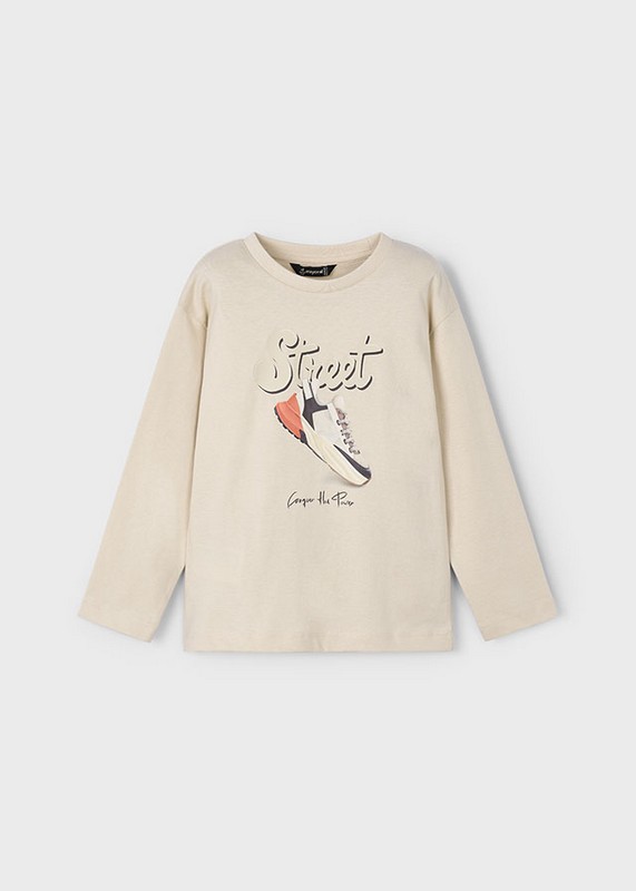 Mayoral for older boys beige long sleeve cotton top with large trendy design on the front of a sneaker and the graphic ‘street’.
